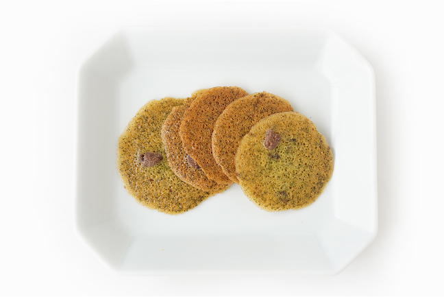 お次はおせんべいでこの味ができるの!? と衝撃を受けたチョコミント。チョコミントのテーマは「オトナのさわやかで甘美なノー・バター チョコミント ラングドシャ」。口に入れる前から爽やかなミントの香りが漂い、いざ口に入れると想像以上の爽快感にびっくりします。