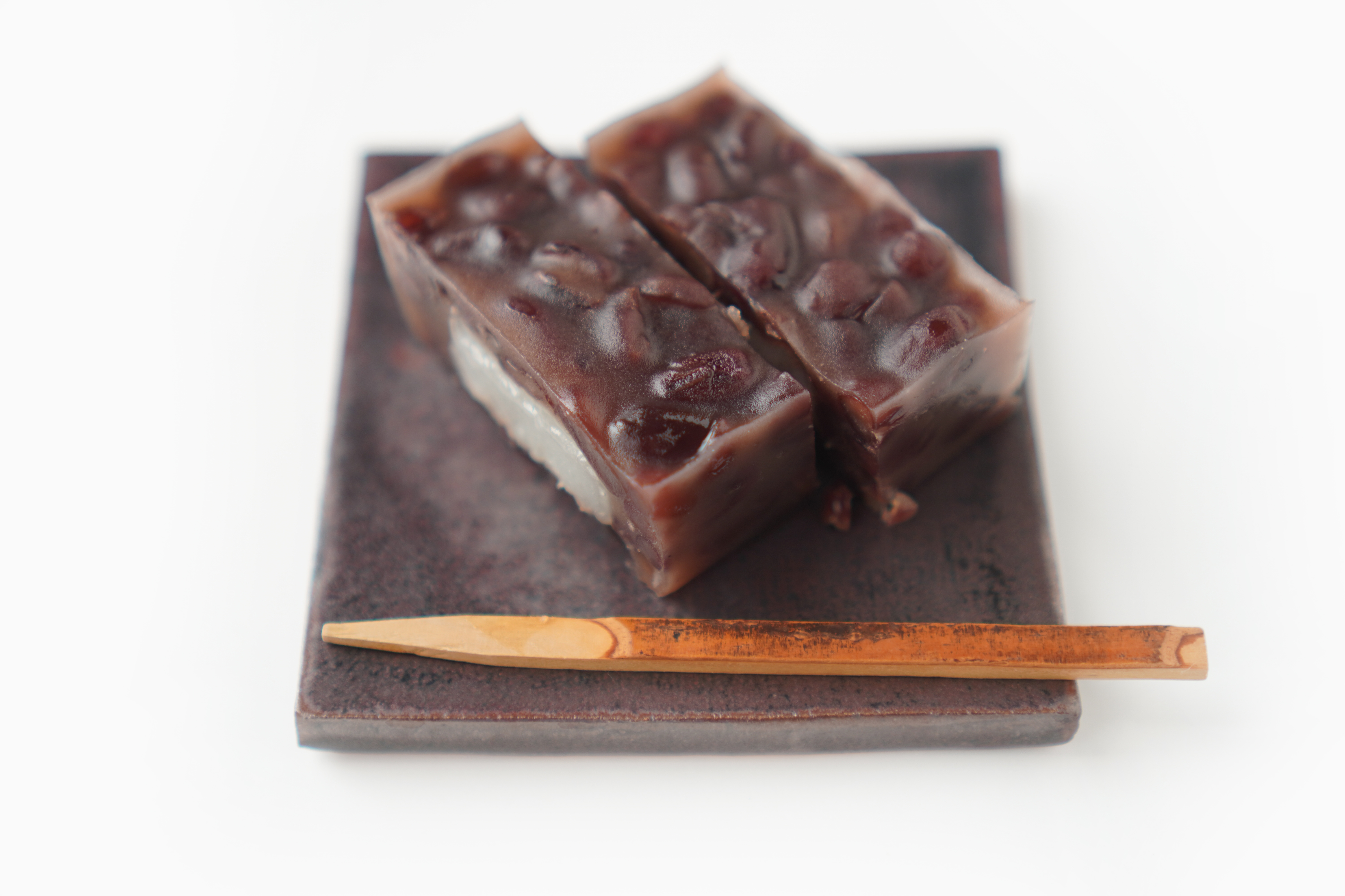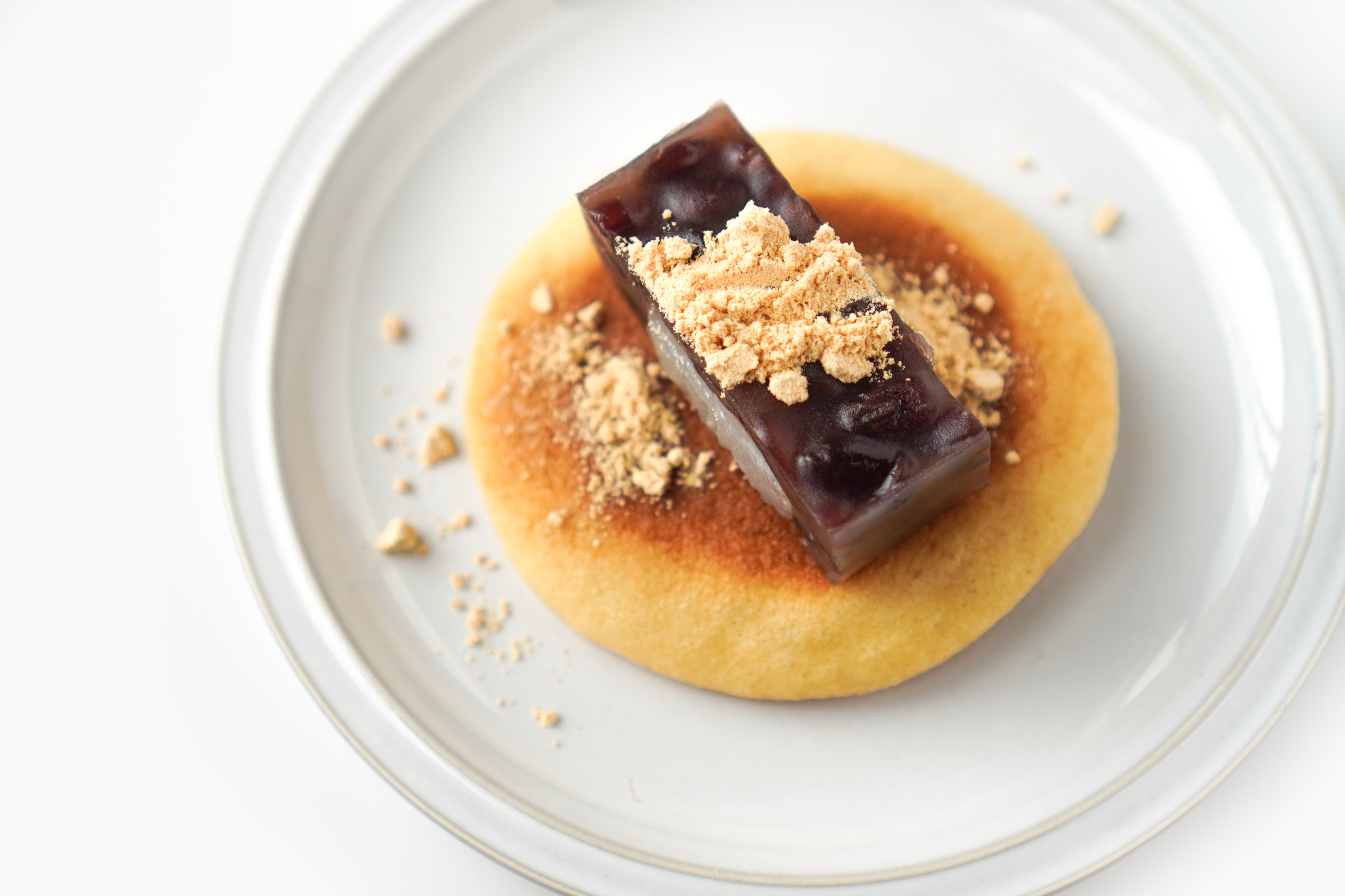 叶 匠壽庵の代表銘菓である「あも」。何度食べても、食べるたびに感動してしまう一品です。周りの小豆には最高品質の丹波大納言小豆が使われ、ほくほくとした食感と、濃厚な味、小豆の香りがたまりません。中に包まれているのはなめらかでもっちりとした羽二重餅。大粒の小豆がきらめいていますね…!