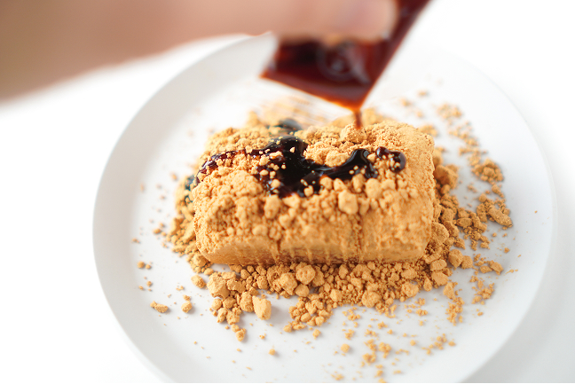 きなこの上に黒蜜をたっぷりとかけていきます。香ばしいきなこの香りがたまりません。