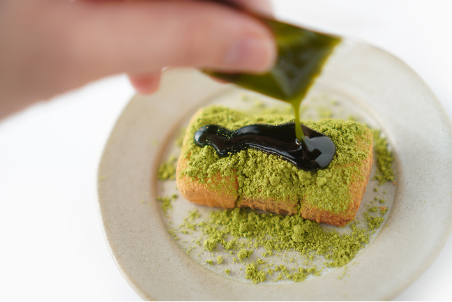 続いては抹茶。こちらには抹茶きなこと抹茶蜜をかけていただきます。とても鮮やかで綺麗な緑色です。
