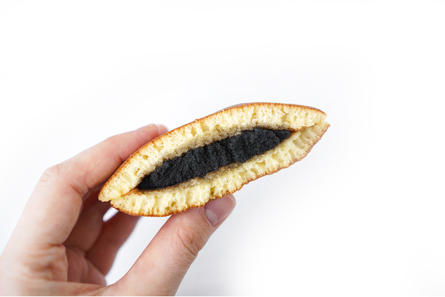 ごまあんなんて珍しいなぁ、と半分に割ると出てきたのはこれでもか! というほど真っ黒なあんこ。そして一口かじると想像以上のごまの濃厚さにびっくりしました。